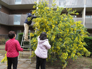 3月初旬の園芸クラブでは、満開になったミモザの花を使ってリースづくりを行いました。春らしいレモンイエローの花が際立ったリースを、皆様玄関扉などに飾られました。